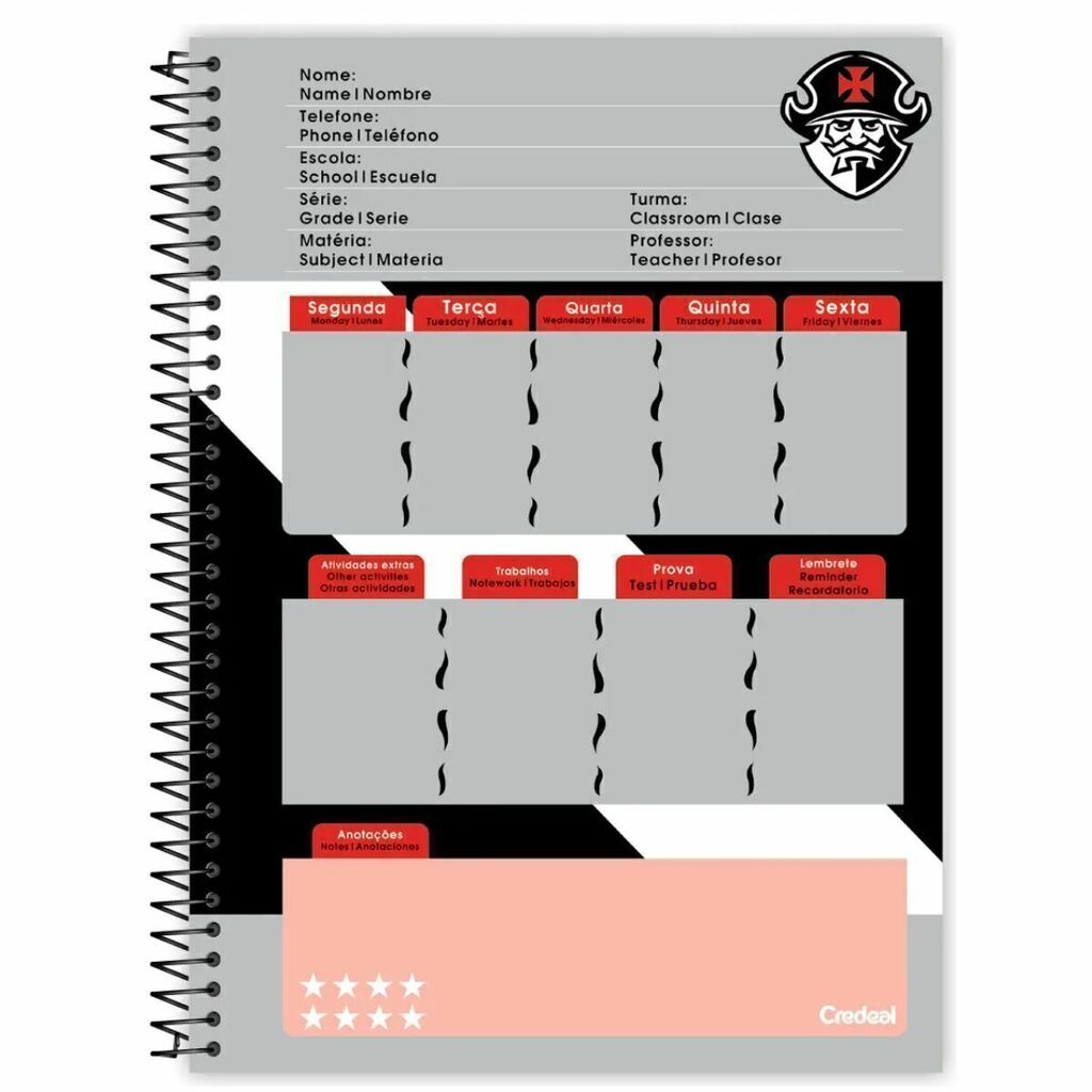 Linha: TimesNome do desenho: Vasco da GamaTipo de produto: CadernoQuantidade de Folhas: 160Tipo de folha: ListradaTipo de Encadernação: EspiralQuantidade de matérias: 10