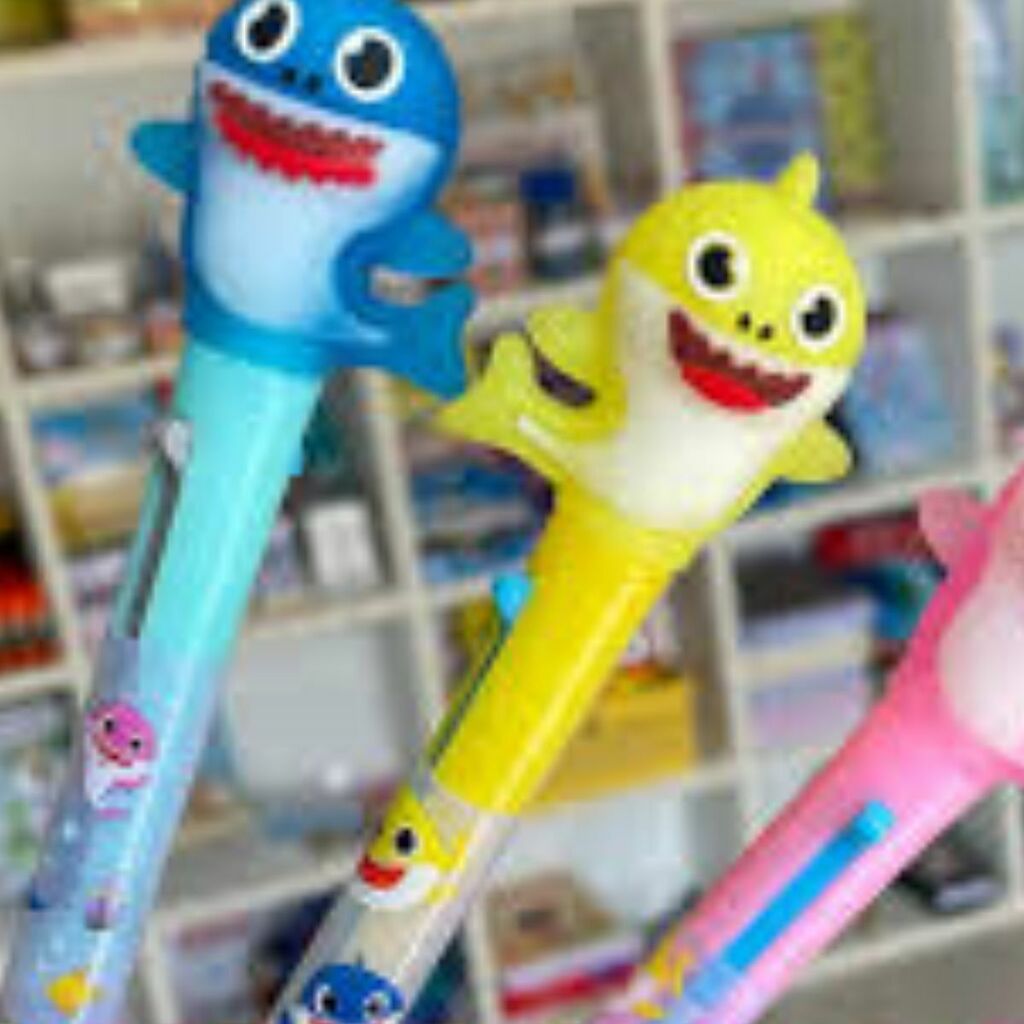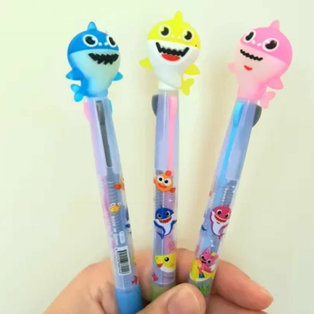 caneta 3 cores, caneta baby shark, caneta colorida, caneta azul preta vermelha, papelaria infantil, material escolar, caneta divertida, caneta infantil, presente criativo, personagens baby shark, caneta com personagens