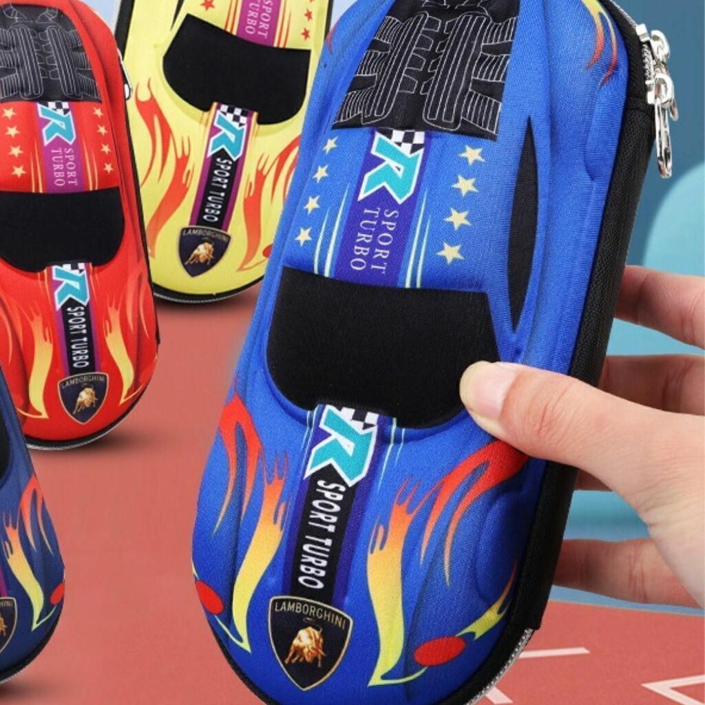 Além disso, possui zíper reforçado, que proporciona segurança no fechamento, e um design exclusivo inspirado em carro esportivo vermelho, tornando o estojo ainda mais atrativo para crianças e adolescentes.
