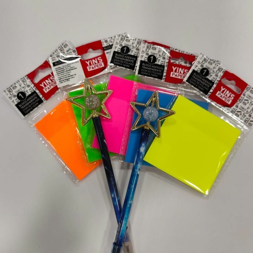 Palavras-chave mais buscadas: bloco adesivo transparente neon, post it neon Yins, caneta preta ponta fina 0.5mm, caneta decorada estrela bola, kit bloco adesivo com caneta, material escolar Yins.