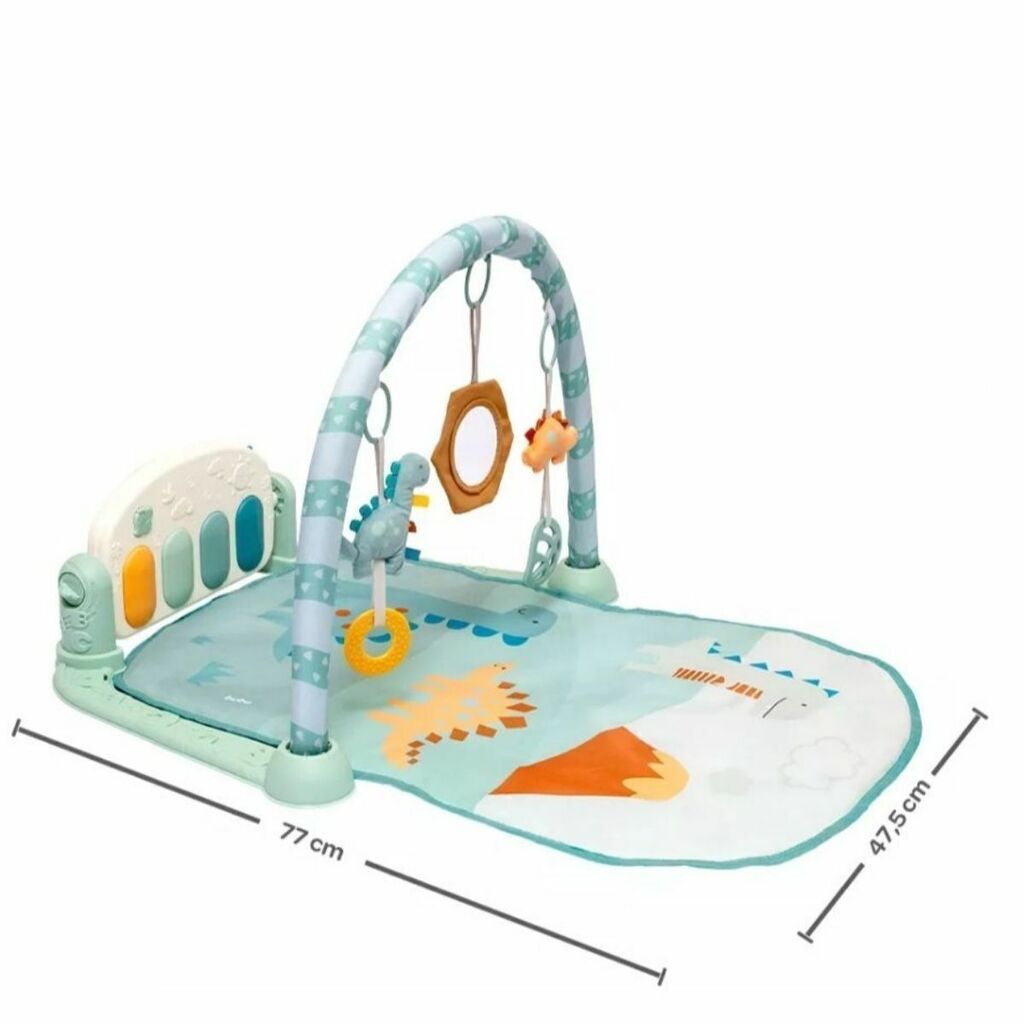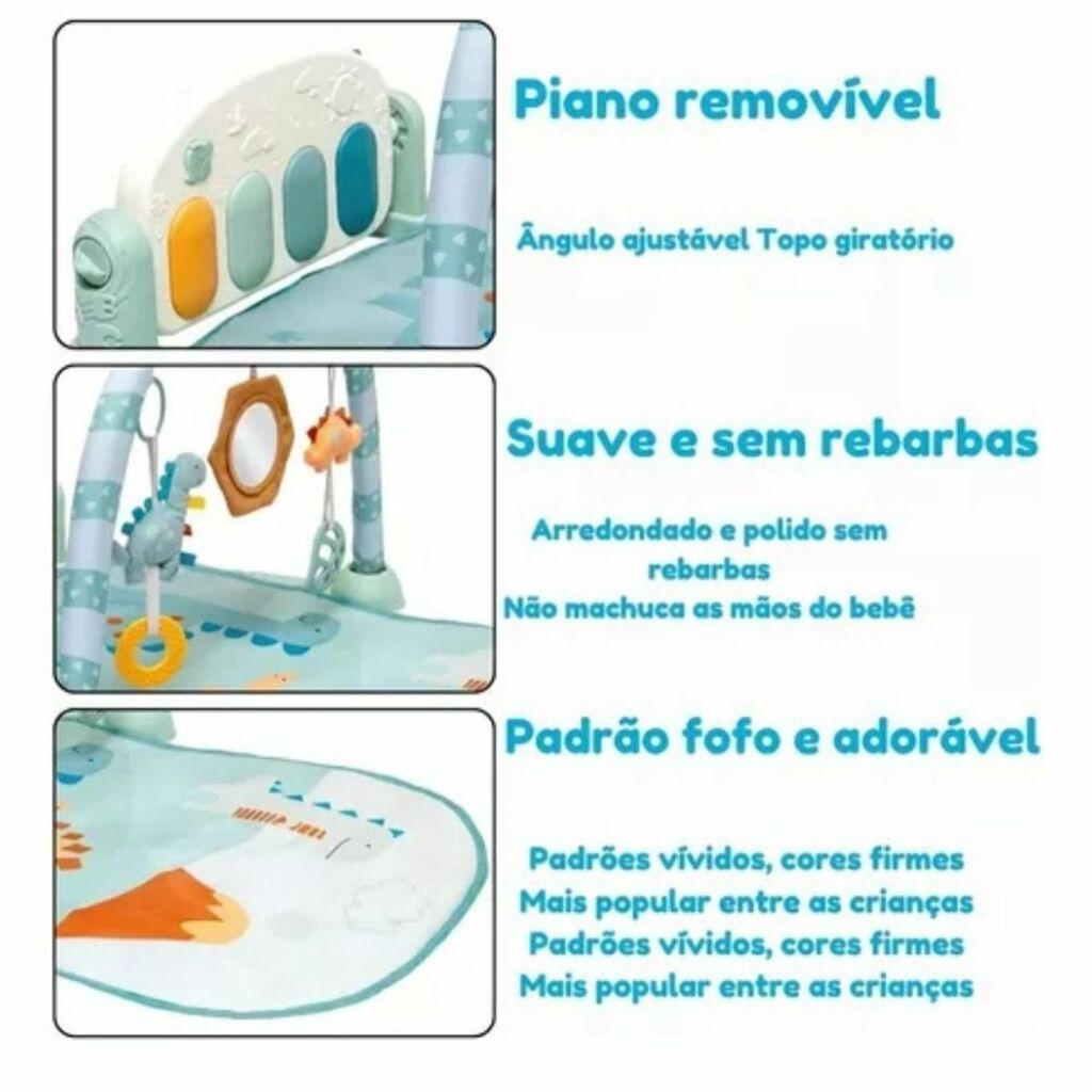O destaque fica por conta do piano interativo, que pode ser acionado com as mãos ou com os pés, incentivando o bebê a se movimentar e explorar. Possui arcos com móbiles temáticos de dinossauro, ajudando na coordenação motora e na percepção visual e tátil. O tapete é macio, seguro e confortável, ideal para o bebê brincar deitado ou sentado.